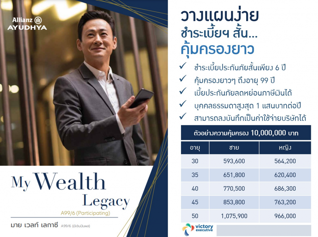 สะสมอย่างมั่นคง เพิ่มพูนความมั่งคั่ง ให้คนที่คุณรัก วางแผนการเงินเพื่อสร้างความมั่นคงให้กับคนข้างหลัง อย่างมีประสิทธิภาพ และคลายกังวลเรื่องภาษี ชำระเบี้ยฯ สั้น เพียง 6 ปี รับความคุ้มครองยาวนานถึงอายุ 99 ปี