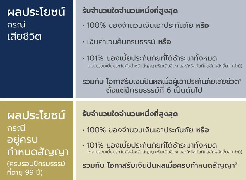 2 เงินปันผลเมื่อครบกำหนดสัญญา (สำหรับผลิตภัณฑ์ที่ใช้อัตราผลตอบแทนจากการลงทุน): บริษัทอาจพิจารณาจ่ายเงินปันผลเมื่อครบกำหนดสัญญาให้กับผู้เอาประกันภัยเมื่อมีชีวิตอยู่จนครบกำหนดสัญญา โดยเงินปันผลดังกล่าวจะขึ้นอยู่กับผลตอบแทนจากการลงทุนตลอดระยะเวลาที่กรมธรรม์ยังมีผลบังคับ ซึ่งผลตอบแทนจากการลงทุนที่บริษัทได้พิจารณาเป็นไปตามเงื่อนไข ข้อกำหนด และวิธีการคำนวณเงินปันผลที่บริษัทกำหนด รวมทั้งขึ้นอยู่กับสภาวะเศรษฐกิจหรือสถานการณ์ในช่วงนั้นๆ